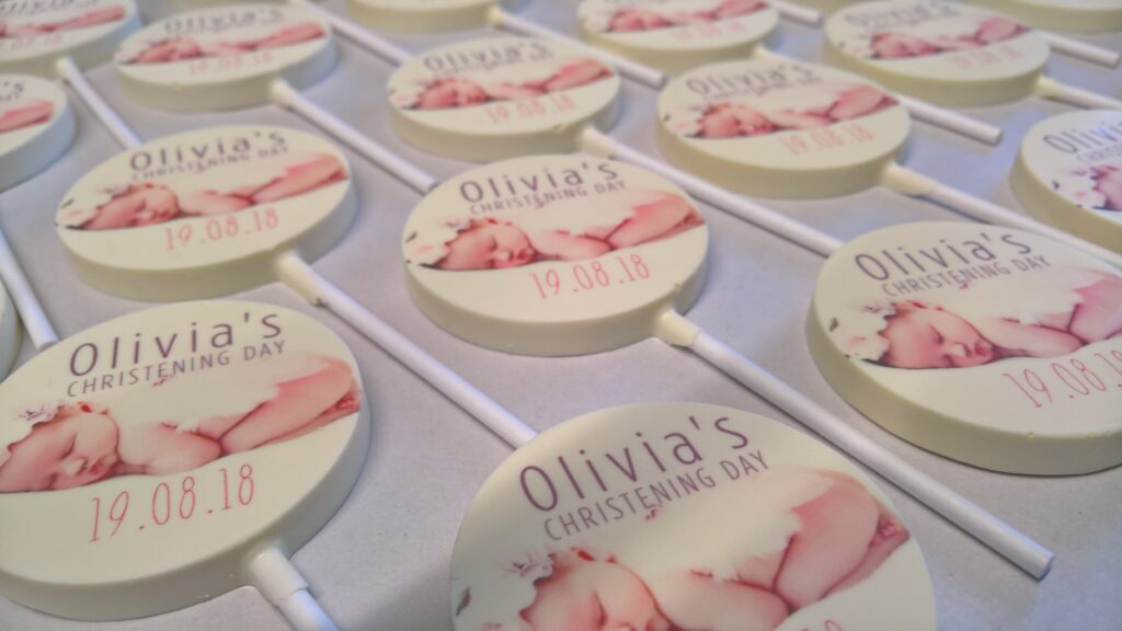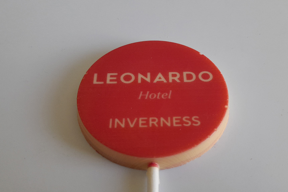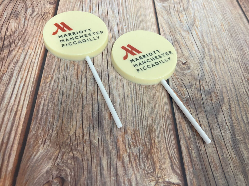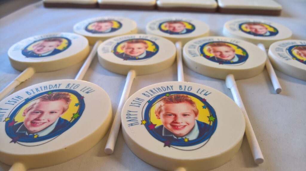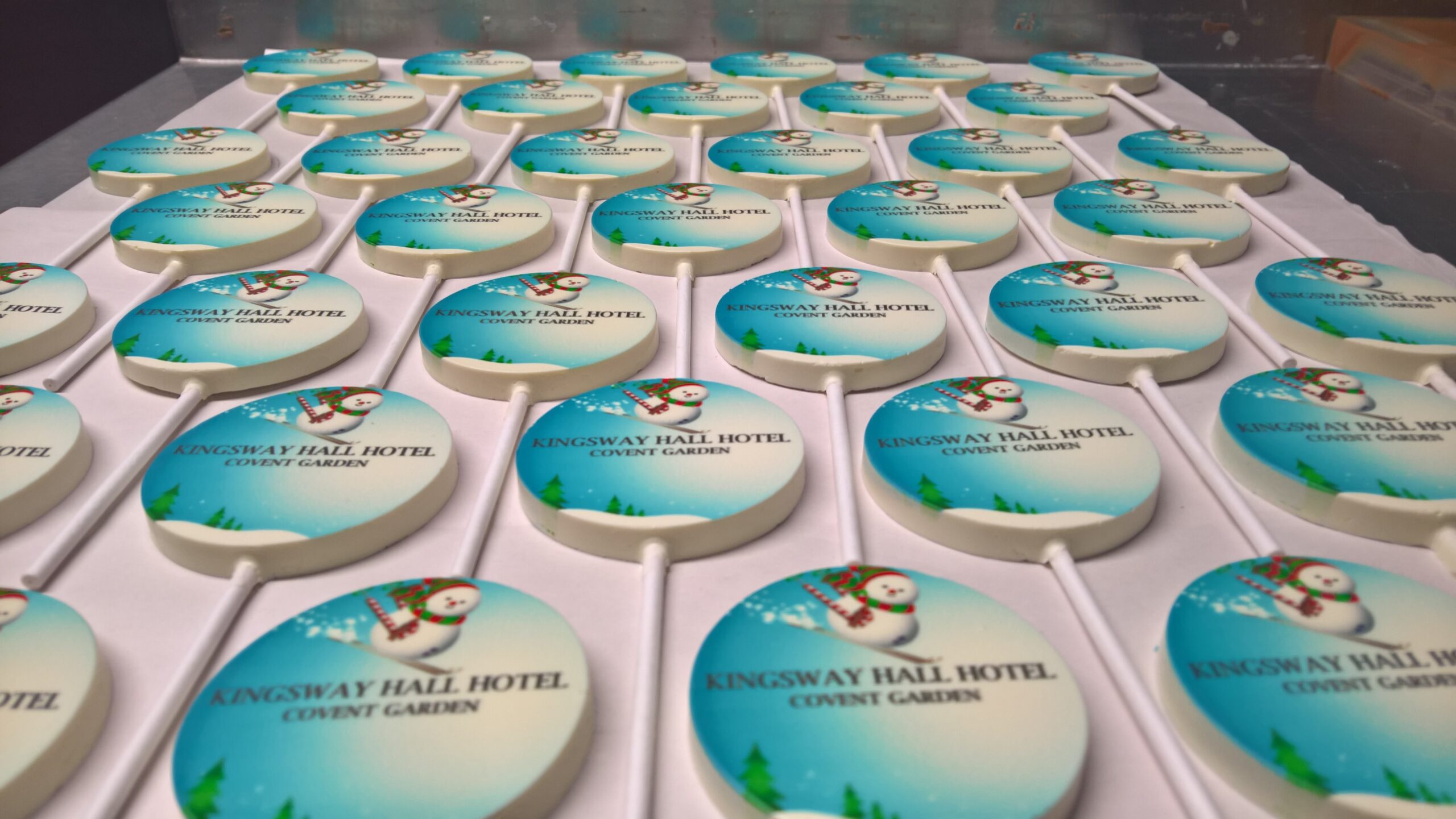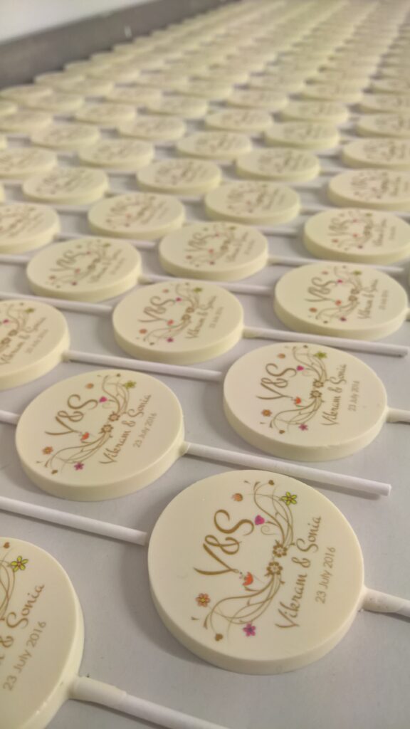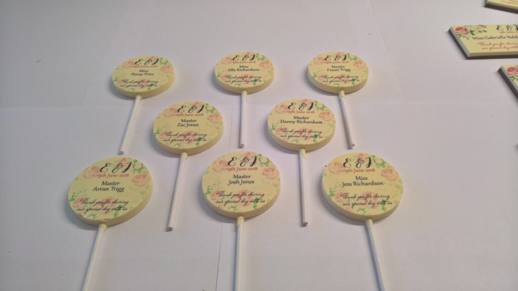 Ingredients: MILK Chocolate (50%) [Sugar, Cocoa Butter, Whole MILK Powder, Cocoa Mass, Emulsifier (SOYA Lecithins), Natural Vanilla Flavouring], White Chocolate (50%) [Sugar, Cocoa Butter, Whole MILK Powder, Emulsifier (SOYA Lecithins), Natural Vanilla Flavouring], Edible Ink [Water, Ethanol. Humectant (Glycerol), Colours (Carmoisine, Tartrazine, Brilliant Blue FCF) Dyes, (Brilliant Black BN, Carmoisine, Brilliant Blue FCF, Tartrazine, Sunset Yellow FCF) Emulsifier (Polyoxyethylene Sorbitan Mono-oleate)].
