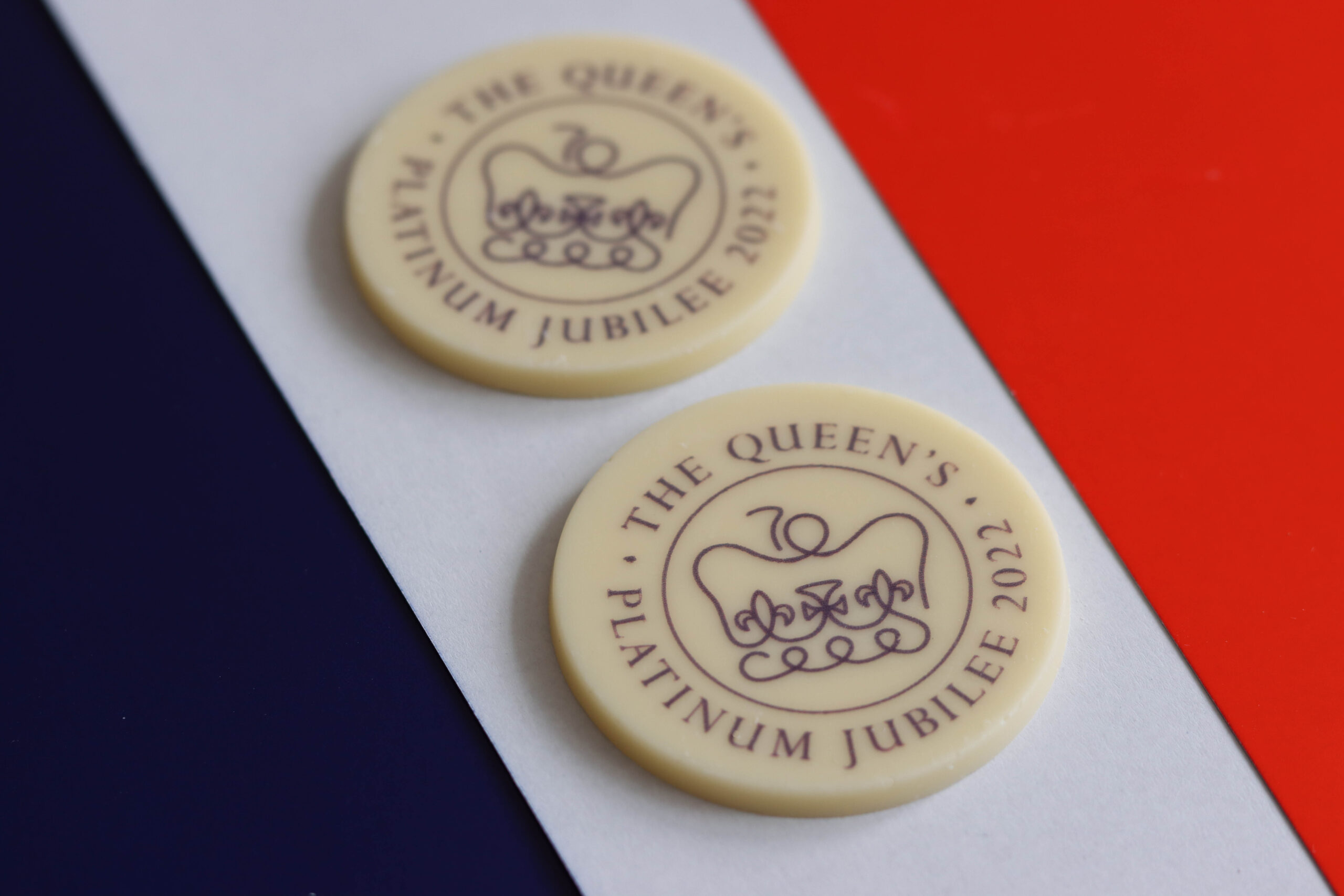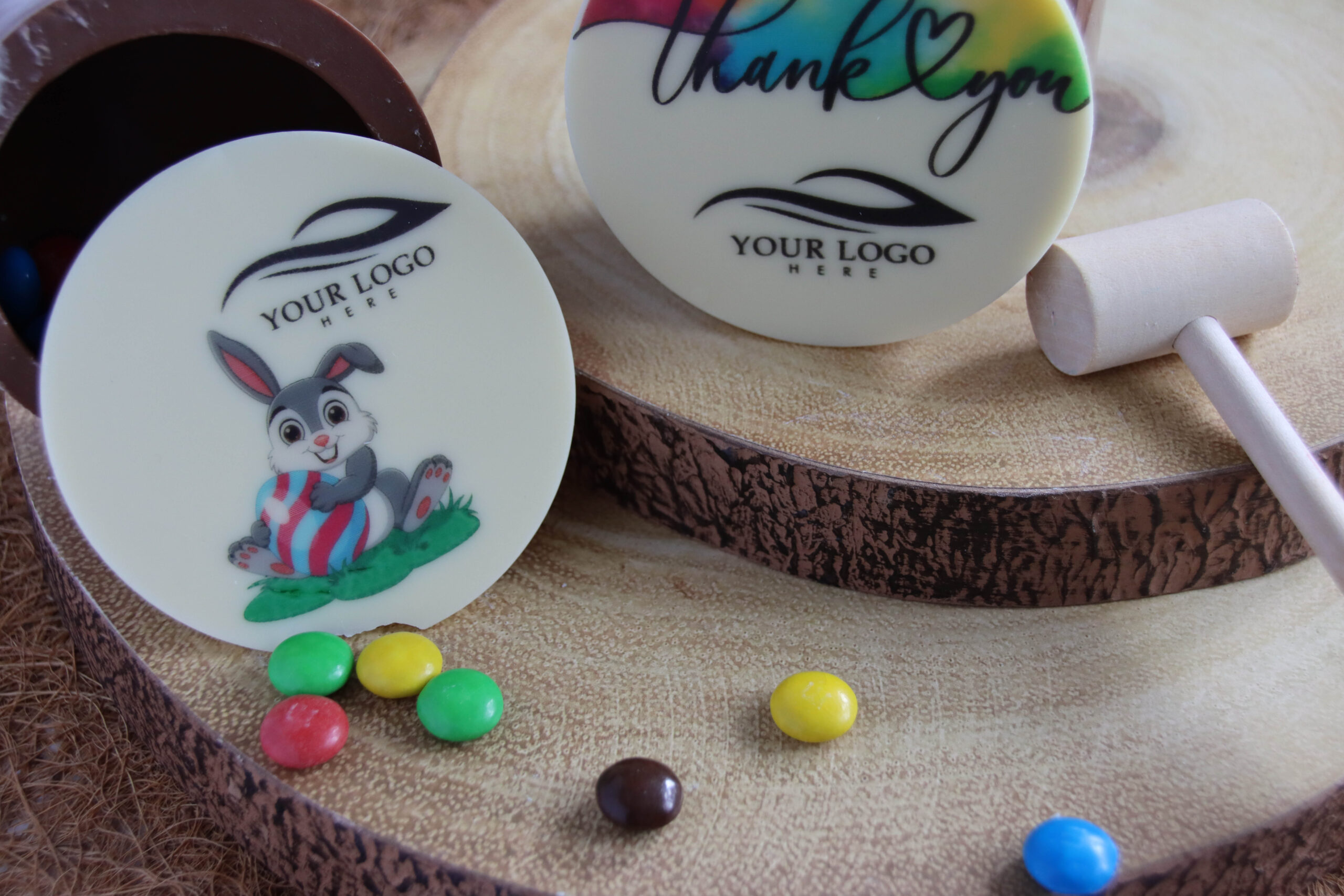 Ingredients: MILK Chocolate (50%) [Sugar, Cocoa Butter, Whole MILK Powder, Cocoa Mass, Emulsifier (SOYA Lecithins), Natural Vanilla Flavouring], White Chocolate (50%) [Sugar, Cocoa Butter, Whole MILK Powder, Emulsifier (SOYA Lecithins), Natural Vanilla Flavouring], Edible Ink [Water, Ethanol. Humectant (Glycerol), Colours (Carmoisine, Tartrazine, Brilliant Blue FCF) Dyes, (Brilliant Black BN, Carmoisine, Brilliant Blue FCF, Tartrazine, Sunset Yellow FCF) Emulsifier (Polyoxyethylene Sorbitan Mono-oleate)].