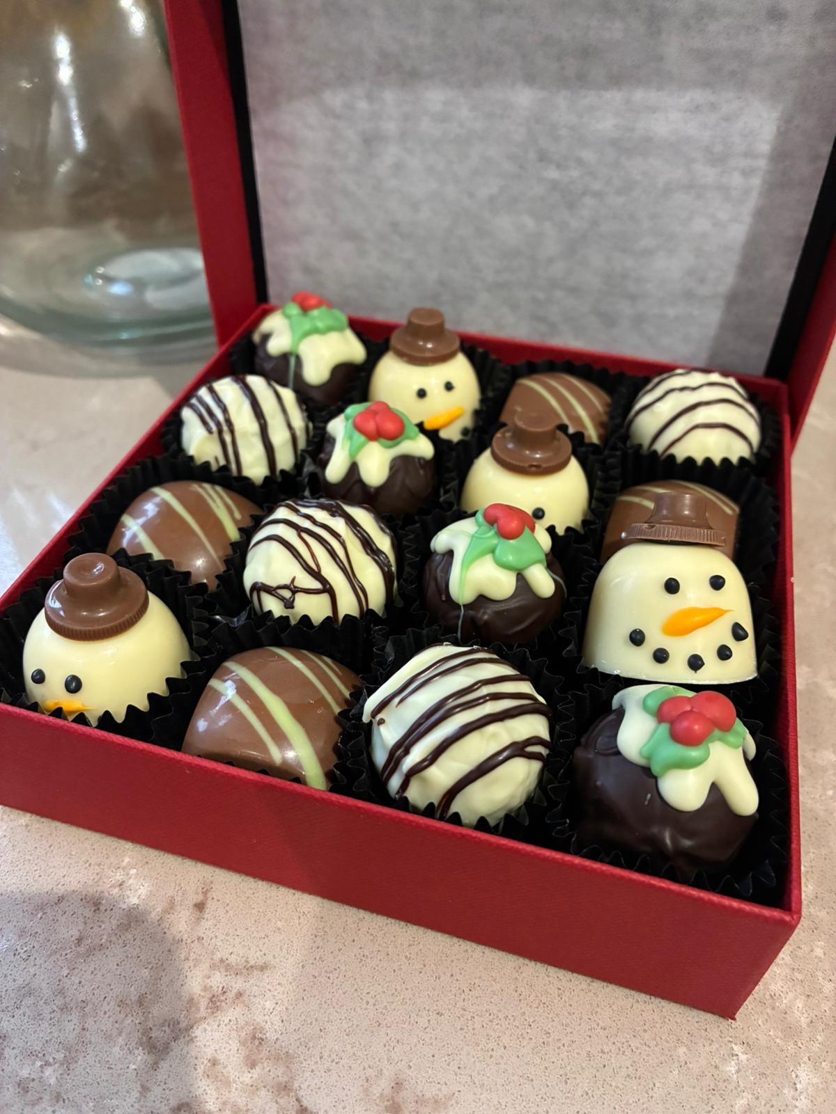 Treat someone special (or yourself) this Christmas with a beautiful box of 16 handmade and hand-decorated truffles. Each truffle is crafted with care and designed to delight — from snowman-shaped vanilla centres to rich salted caramel puddings and refreshing mint squares. Presented in a festive red box, these chocolates make the perfect stocking filler, hostess gift or after-dinner indulgence.